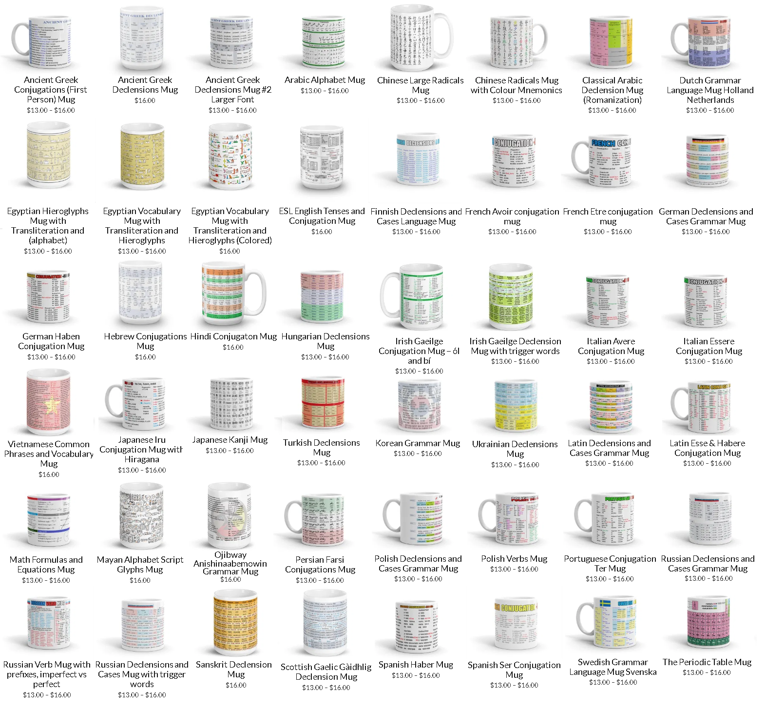 The idea for my first mug  actually first had its infancy as a bookmark. In order to study Polish declensions I decided to put all the most popular nouns and  trigger words on a small piece of paper and laminate them and use it as a bookmark when I was reading a book in Polish. Then in 2018, when I was living in Poland (and unemployed) I realized that if I needed it others might as well. But instead of bookmarks I decided to use mugs and try selling them on Etsy. I figured if they were made on mugs they can be functional and durable not to mention waterproof. I ended up selling one and then I decided to create more languages. The idea was all my own and thought of independently. “